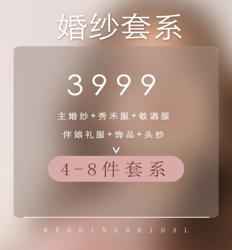 主婚纱:提供20款以上选择 主婚纱:店内主推主婚纱1件 出门纱:全场出门婚纱1件 敬酒服:全场敬酒服任选1件 伴娘礼服:全场伴娘礼服任选1-4件 饰品搭配:主婚纱头饰免费搭配,出门纱饰品免费搭配(耳环、项链、裙撑、头饰) 头纱搭配:主婚纱头纱免费搭配,出门纱头纱免费搭配 免费试纱:有 试纱说明:免费试纱 清洗和修改:免清洗费,免费修改尺寸